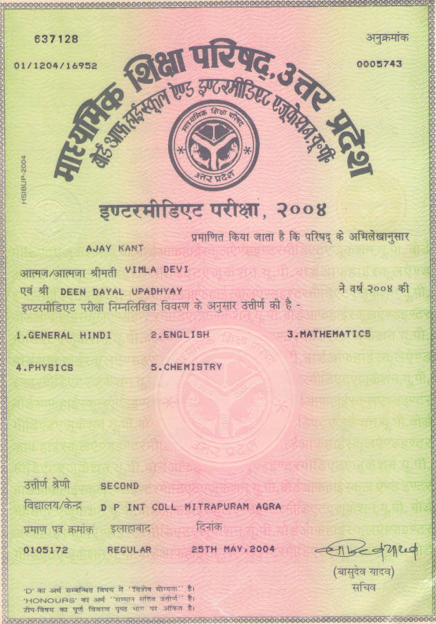 3. Intermediate (12th) in stream of science from D. P. Inter College, Mitra Puram, Kehrai Road, Agra, affiliated to Uttar Pradesh Board in 2004.