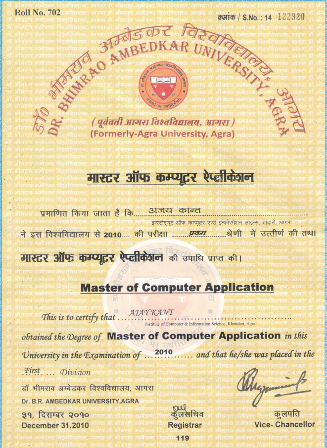 1. Master of Computer Application (M.C.A.) from Institute of Computer and Information Science (ICIS), Khandari, affiliated to Dr. Bhim Rao Ambedkar University, Agra in 2010.