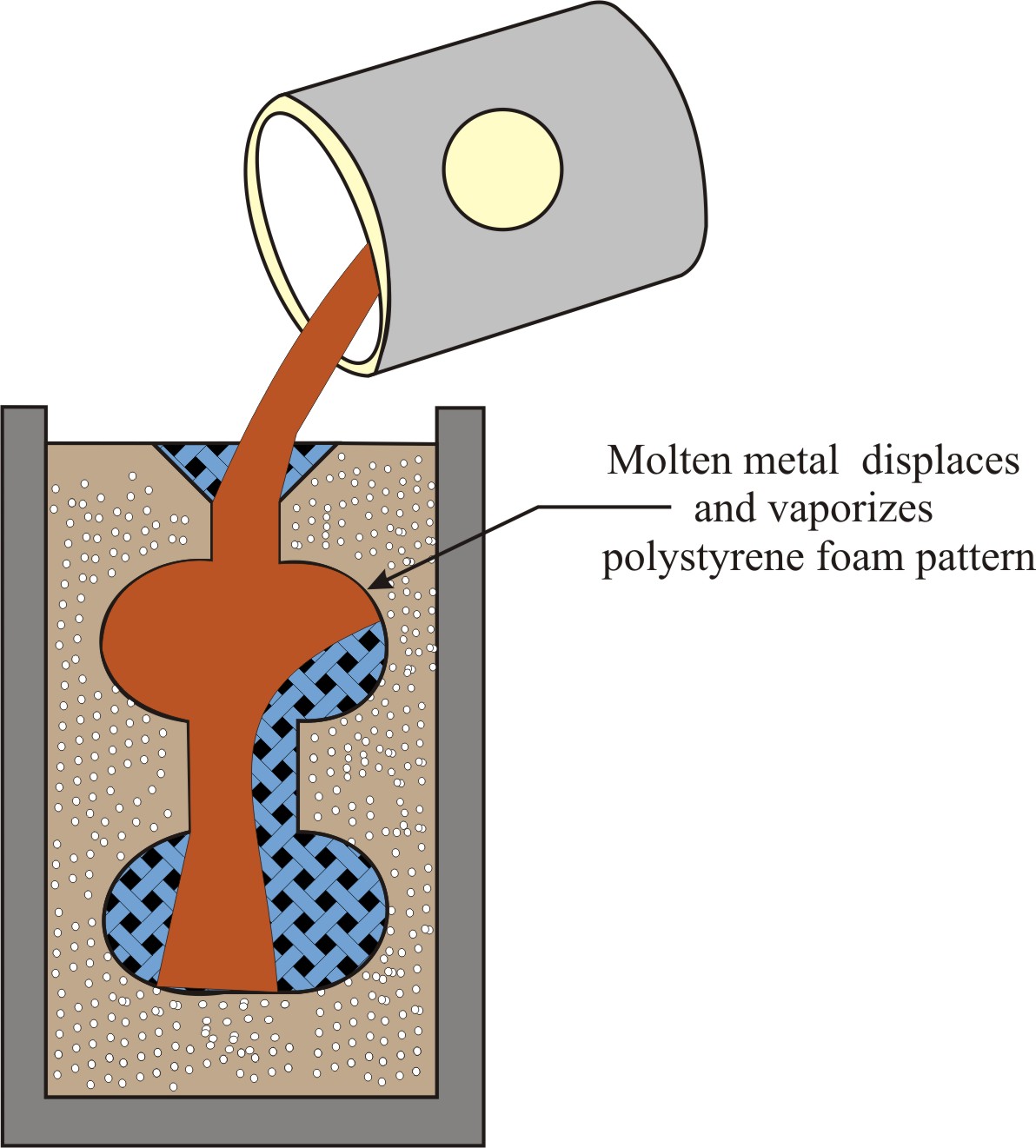 Note: Molten metal is poured rather rapidly into the sprue, the polystyrene vaporizes and the metal fills the remaining cavity. The mold is poured fast enough to prevent combustion of polystyrene, with the resulting carbonaceous residue. The gases due to vaporization of the material are driven out through the permeable sand and vent holes.