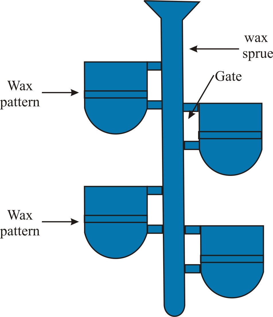 (b) Connecting together a number of cast wax patterns with previously cast wax gates and sprue (for metal flow in the molds) and thus preparing a tree with the aim of mass producing a stack of investment molds, followed by precoating of wax pattern tree with fine refractory material,
