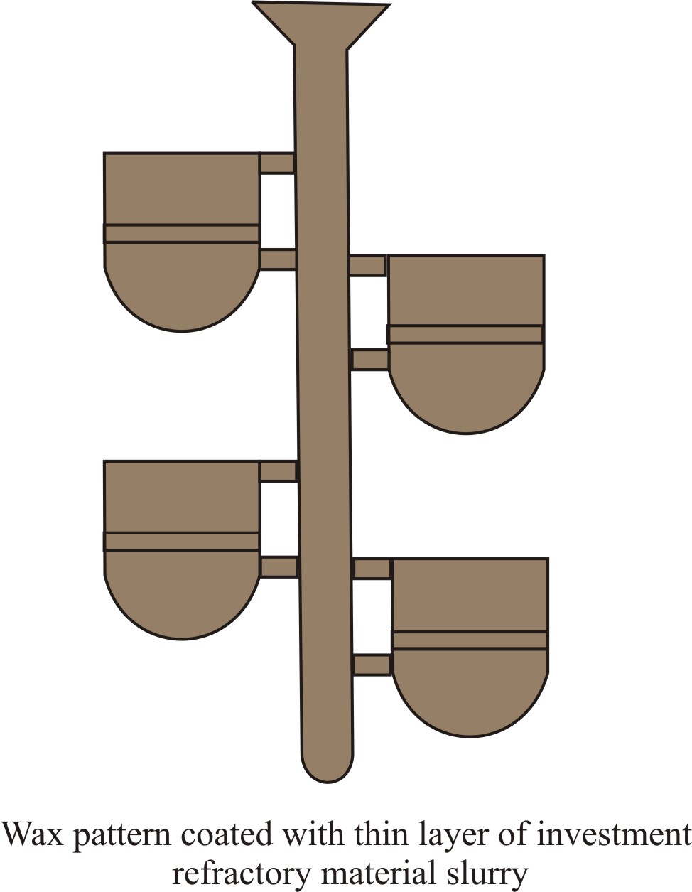 (c) Preparing an investment mold (or molds) by investing (or dipping completely) the precoated wax pattern assembly into an investment material, which is a coarser and viscous refractory material fine slurry with some binder. Then, the pattern is taken out of the slurry and rotated and vibrated for compacting in order to produce a uniform coating, to fill inside corners and to drain out the excess slurry.