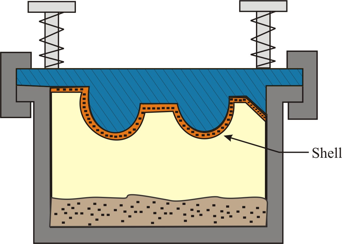 Shell moulding process is also known as Croning process or C-process after the name of its inventor Johannes Croning. Shell moulding replaces conventional sand moulds by shell moulds made up of relatively thin (only 0.3 mm to 0.6 mm thick), rigid shells of approximately uniform wall thickness. Shell moulds are made up of mixture of dry silica sand and 3 to 10% phonemic (phenol-formaldehyde, thermosetting resin) resins that are formed into thin half mould shells, which are held with clamps or adhesive for pouring as shown in Figure 2(f).
