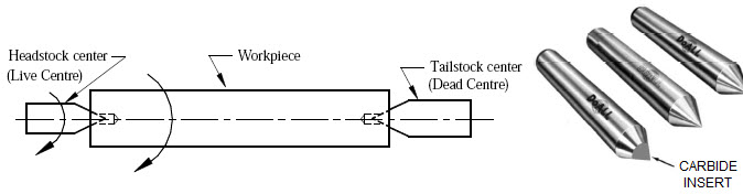 When the length of job large and if it cannot be conveniently held in a chuck, the workpiece can be held and rotated between the headstock centre (the live centre) and the tail stock centre (the dead centre). Turning between the centres is the classic way of machining the barstock with maximum accuracy. The work can be mounted