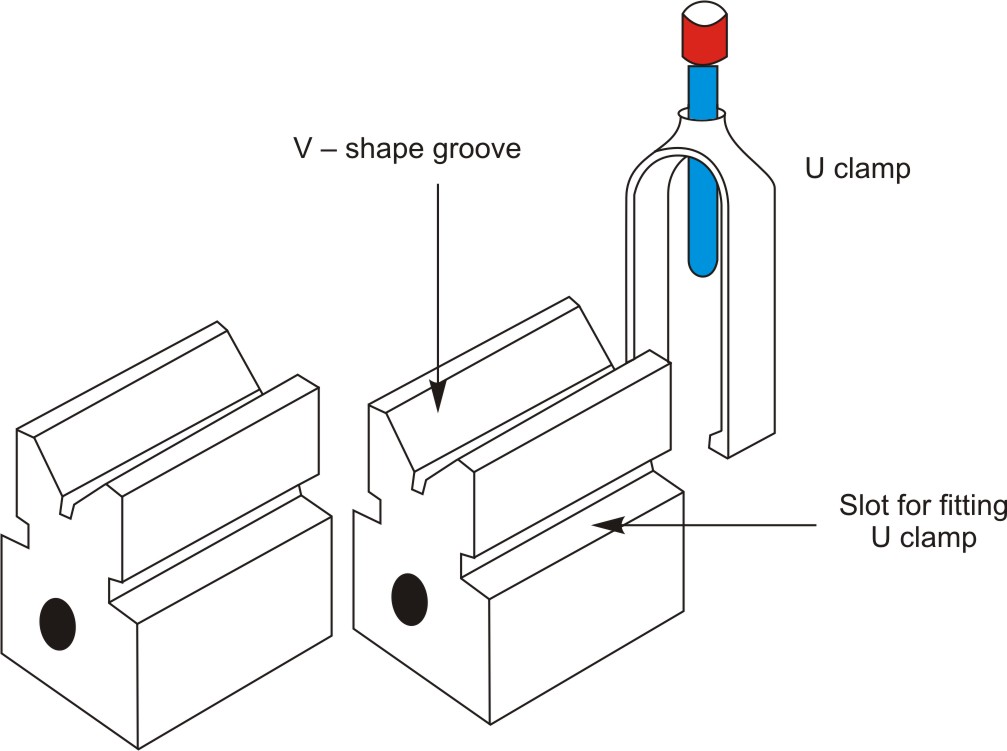 It is a rectangular block of hardened and ground steel. V-blocks are widely used to hold cylindrical parts for layout, for locating and drilling holes in cylindrical workpieces and also for checking the angles of 45 degree or 90 degree of workpiece surfaces. It has V-shaped angular surfaces, which form 90 degree angle and are central with the sides of the block. Round workpieces of different diameters may be centered and nested in V-blocks. Slot cut in both sides of the block enable the use of U-shaped clamp holding the cylindrical workpiece in the position.