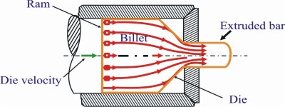 MANUFACTURE: Hot extrusion is a metal forming process of forcing a heated billet to be reduced in its cross section by forcing it to flow through a shaped die opening under a high pressure. During extrusion metal billet is under compression stress state in all three direction and shear forces, No tensile force is produced, which makes high deformation possible without tearing the metal. The hot extrusion is the widely used due to its relative low deformation resistance of the metal for production of long straight metal products of constant cross section (such as bars, solid and hollow sections, tubes, wires and strips) from materials that can not be formed by cold extrusion. Hot extrusion is an attractive process in industry due to its ability to achieve energy and material savings, quality improvement and development of homogeneous properties throughout the component. In spite of these advantages the process is rather complicate as it requires careful control. In the industrial application of the extrusion process, die design and process control are mainly based on empirical knowledge.