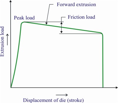 In hot extrusion process a preheated billet is loaded into the container and ram presses this billet through a die, producing a profile with a cross-section determined by the shape of the die orifice. Solid profiles are generally produced with a die that consists of only one part (at die). Hollow profiles are produced with a porthole die, which consists of two parts, a mandrel to define the inner geometry of the profile and a die plate which defines the outer geometry. Principal parameters for the hot extrusion are: the extrusion ratio, the working temperature, the speed of deformation, the frictional conditions and lubrication. The extrusion ratio is the ratio of the initial cross-sectional area (A0) of the billet to the final cross-sectional area (A1) after extrusion, R = A0/A1. This is actually another name for elongation. For temperature selection, the two factors that’s need to be considered are the temperature at which hot shortness occurs, or, for pure metals, the melting point, temperature rise due to heat generation during metal deformation and friction. This temperature rise is affected by the extrusion ratio, speed, etc., Heat transfer at billet-tooling interface and heat conduction within the billet and the tooling. Increasing the ram speed produces a tendency to increase the extrusion pressure; on another hand, however, low extrusion speeds leads to greater cooling of the billet and thus a tendency to increase the extrusion pressure. The higher the temperature of the billet, the greater the effect of low extrusion speed on the cooling of the billet it has. Therefore, high extrusion speeds are required with materials (e.g., high strength alloys) that need high extrusion temperatures.