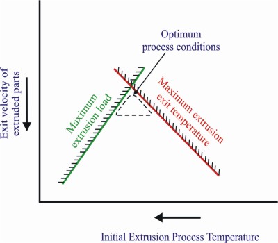 Figure 3: Extrusion process is limited by two factors, the maximum extrusion load and the maximum exit temperature