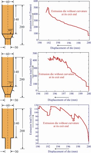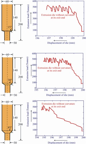 Figure 5: Dies with different inclination angle w.r.t. horizontal with their corresponding extrusion load curve w.r.t. displacement of the upper die.