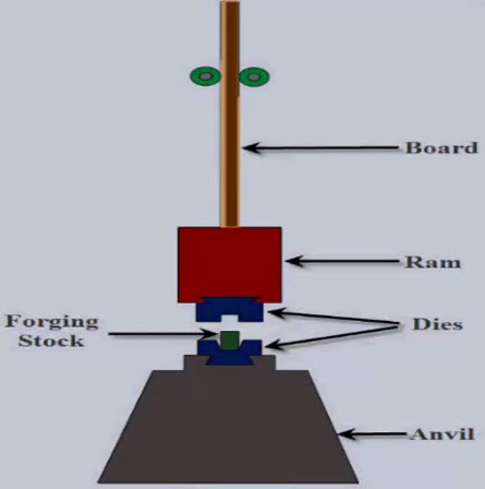 Power Drop Hammer: In this hammer, the ram's downstroke is accelerated by the steam, air , or hydraulic pressure at about 750kPa.Ram weights range from 225kg to as much as 22,500kg, with energy capacities ranging upto 1150kj.