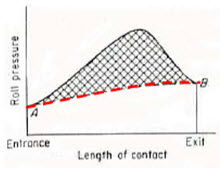 distribution of the roll pressure along the arc of contact shows that the pressure rises to a maximum at the neutral point ant then falls off.