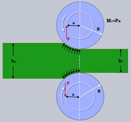 However the total rolling load can be assumed to be concentrated at a point along the arc of the contact at a distance a from the line of centres of the rolls.