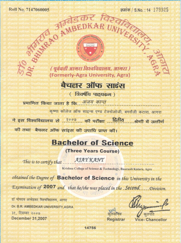 2. Bachelor of Science (B.Sc.) in Physics, Chemistry and Mathematics from Krishna College of Science and Technology, Bamrauli Katara, affiliated to Dr. Bhim Rao Ambedkar University, Agra in 2007.