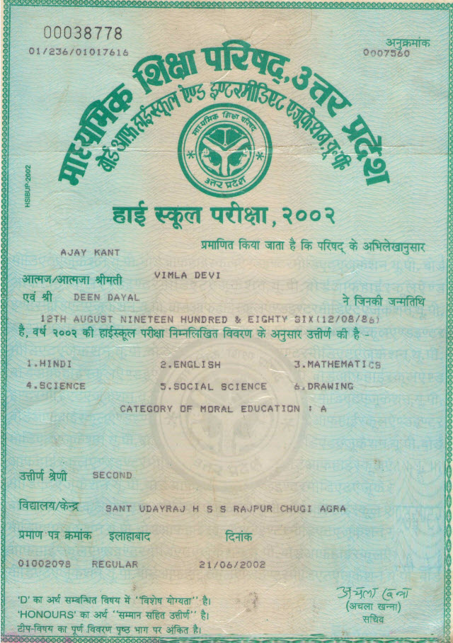 4. High School (10th) in stream of science from Sant Udayraj Uchchatar Madhyamik Vidhyalaya, Rajpur Chungi, Agra, affiliated to Uttar Pradesh Board in 2002.