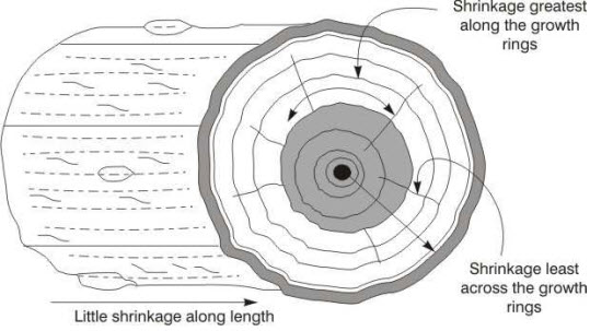 When timber is seasoning and it's moisture content (MC) is reduced below the Fibre Saturated Point (FSP) continued drying will cause dramatic change such as increase in strength but also distortion and shrinkage. Shrinkage is the greatest tangentially over the radial direction with little loss along the length of the board, etc.