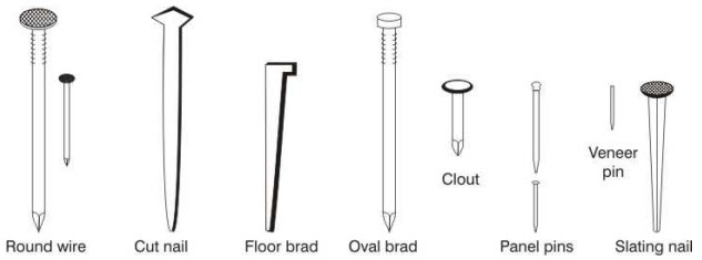 Using nails is an effective way of fixing or joining pieces of softwood together. Hardwoods can be difficult to join with nails as they tend to bend under the impact of the hammer. Below is a range of nails that can be used depending on the type of wood and the nature of the work to be attempted.