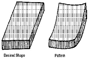 Certain cast shape, such as large flat plates and U shaped castings, sometimes distort when reproduced from straight or perfect patterns. This distortion is caused by the non-uniform contraction stresses during the solidification of irregularly shaped designs. Mechanically pressing or straighting normally corrects minor distortions. To eliminate this defect an opposite distortion is provided in the pattern, so that the effect is neutralized and the correct casting is obtained.