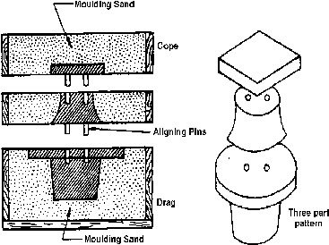 This type of pattern is used when the pattern if made is single piece will give rise to withdrawal difficulties from the mould. Split pattern consists of two pieces; one half of the pattern rests in the drag (lower part of the moulding box) and the other half in the cope (upper part of the moulding box).