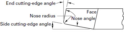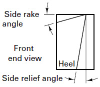 The standard terminology is shown in the following figure. For single point cutting tools, the most important angles are the rake angles, end relief angle and side relief angle.