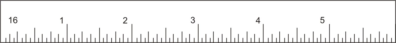 English system rules are usually 6 or 12 inches long. The English system rules use fractional divisions. The fractional divisions for an inch are found by dividing the inch into equal parts - halves (1/2), quarters (1/4), eighths (1/8), sixteenths (1/16), thirty-seconds (1/32), and sixty-fourths (1/64) Precision machinist rules have 1/64-inch divisions. Some rule only use the fine scale divisions at one end of the scale.